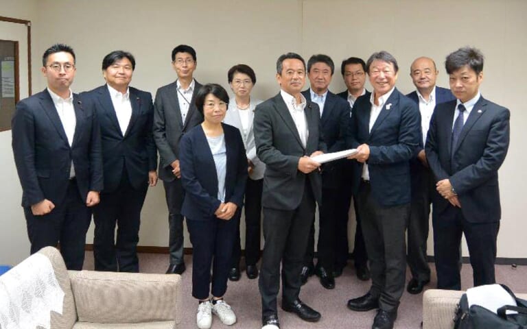 都内のバイク取締りの経緯や現状など様々な資料を添えて要望書を手渡すAJ東京の野間理事長(中央右)と江東区議会公明党の石川邦夫幹事長(中央左)。AJ東京NEWS(’19年9月14日)より引用。