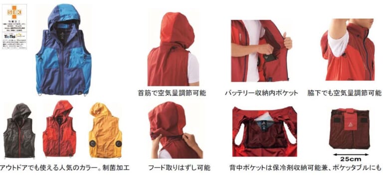 空調ウェアは従来上半身全体に風がめぐるよう、気密性の高い生地で長袖タイプが主流でした。しかし最近、アウトドアやスポーツなどでも人気が広がり、袖のないベストタイプが人気になっています。電源を入れていない時もよりスタイリッシュに見え、両腕の動かしやすいベストタイプは女性にも人気が広まっています。これまで空調ウェアはファン、バッテリーセットで購入すると1万5000円~2万円、中には2万円を超える製品が一般的でしたが、このシェルシリーズはベスト2900円+ファンセット3900円+ハーフバッテリー4900円の計1万1700円で揃うのも人気の秘訣です。