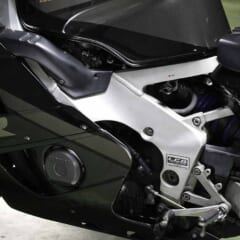 ヘッドパイプからスイングアームピボットまで一直線に伸びるツインスパーのように見えるが、低重心化のため途中で屈曲しているのがLCGフレームの特徴。外装一式は純正グラフィックで再塗装済みで美しい。