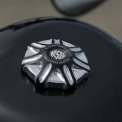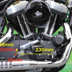 【タンクリフトアップ】フォーティーエイトに限らないが、特にスポーツスターで人気の小ワザがタンクのリフトアップ。マウント位置をさり気なく上げて、窮屈さを解消! 【グライド ホイール9S】ベース車両はクロススポーク仕様の'15年式だが、グライドホイールでキャスト化。スポーティさを見事に演出した。【フォワードコントロール→ミッドコントロール】フォワードコントロールのフォーティーエイトだが、ミッドステップに戻し車体を操りやすく。スポーツスターならではの軽快な操作性が気持ちいい!!