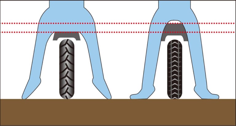 そう、シート高が足着き性を左右するのは確かなのだが、ただ低ければいい……というわけでもない。足を下ろす部分の車体幅が広いと、太ももが左右に押し広げられ、シートの高い車両より足着きが悪いこともあるし(上の図参照)、地面に下ろした足とステップが干渉する場合も同様。たとえば大人気のホンダGB350なども、サイドカバーの張り出しがやや大きく、800mmという数値からイメージするよりも、わずかではあるが足着き性がスポイルされる傾向にある。