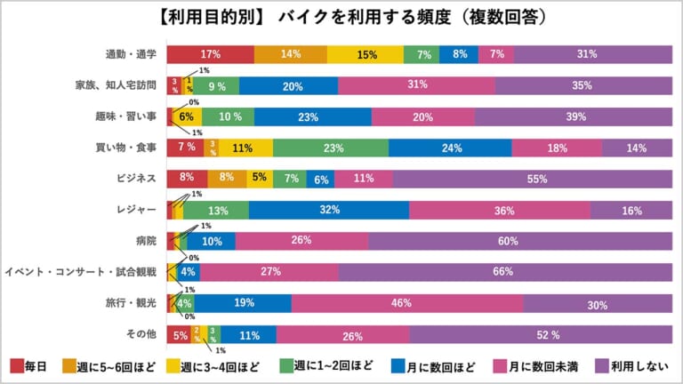 【グラフ1:バイクを利用する頻度(利用目的別)】「バイクを毎日利用する」と回答した人を利用目的別に見ると「通勤/通学」が17%ともっとも多かった。