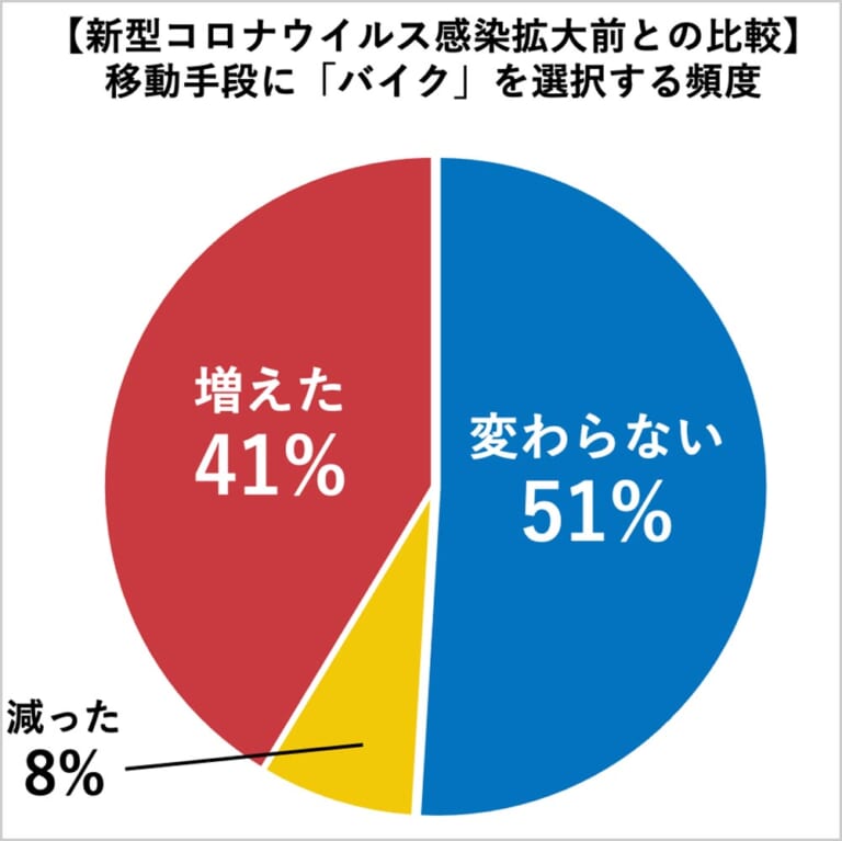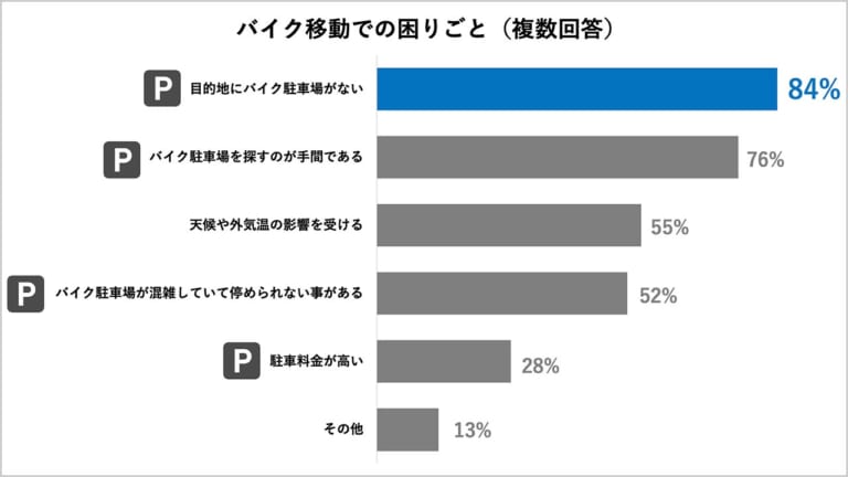 アンケートでは、41%の人が新型コロナウィルスの感染拡大前と比べて「移動手段にバイクを用いる機会が増えた」と回答(グラフ2参照)した。また、通勤/通学時には「公共交通機関等の混雑を避けたい」という意見が多く挙がった。さらに、バイクを利用する頻度について利用目的別に聞くと「通勤/通学」と答えた割合が17%ともっとも多かった(グラフ1参照)。一方で、バイク移動での困り事としては「目的地にバイク駐車場がない」という回答が84%も占めていた(グラフ3参照)。