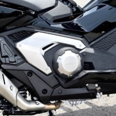 【新設計フレーム採用。単体で約1kg削減】右側クランクケースを強調した新デザインに。フレームはNC750Xと同様にパイプ構成の変更や肉厚最適化などを受け、単体で約1kgの軽量化を達成。アルミHPDC(高圧鋳造)のスイングアームは先代からそのまま継承。