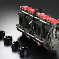 Z1用ヨシムラMIKUNI TMR-MJN28キャブレター(左。30万8000円)。スロットルポジションセンサー付きも34万1000円で設定される(右)。スロットルのインナーパイプが同梱されるのはTMR-MJN32と同様だ。