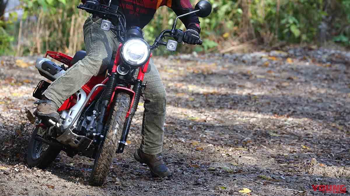 エンジンは、長く乗っていても飽きないフィーリング。というより、ライダーをジャマしない。だから、延々と走っていても疲れない。でもそれ以上に着目したいのは”心強さ”だ。カブというブランドに由来する、「コイツなら壊れない/走破できる/低燃費だからガソリンも問題ない」という信頼性は、ど田舎で脇道に入って、あるいは林道を突き進んで、道が狭く細く民家も何もなくなってきたようなときに真価を発揮する。荒れた道をゆっくり進むようなときも、カブ系エンジンなら「絶対にエンストしない」という頼もしさがある。