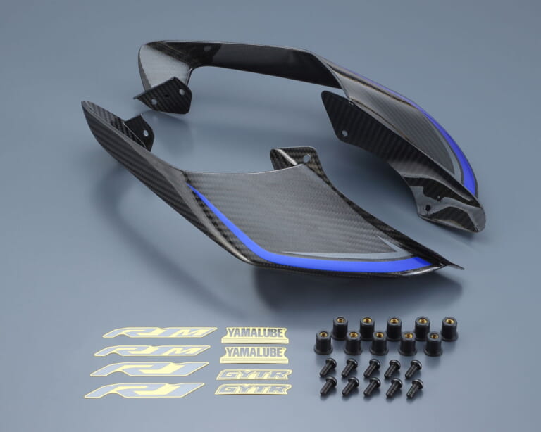 取り付けは左右カウルに穴開け加工が必要だが、ドライカーボン製で片側重量は約70gと、付属のステッカーで重量が増してしまうんじゃないかと心配になるほどの超軽量ぶりだ。発売は2021年10月。R1オーナーなら必見のアイテムといえよう。