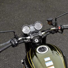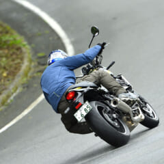 ビッグネイキッドらしいボリューム感はあるけど、シート前方を絞るなどの工夫で足着き性を向上。身長168cm、体重61kgの丸山浩氏だと、両足の裏が半分ほど接地する。ハンドルはやや幅広で、これもまた大きさの演出につながっている。