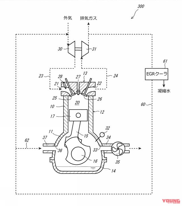 カワサキによる「4ストロークエンジン及びクランクケースの内部における着火防止方法」という特許の出願情報が2021年9月2日付で公開された。このエンジンは、水素ガスを含む燃料もしくは含まない燃料(ガソリンのことだろう)で運転可能な4ストロークエンジンであり、水素ガスを用いた場合に問題となるブローバイガスをいかにして換気するか、という技術が骨子である。