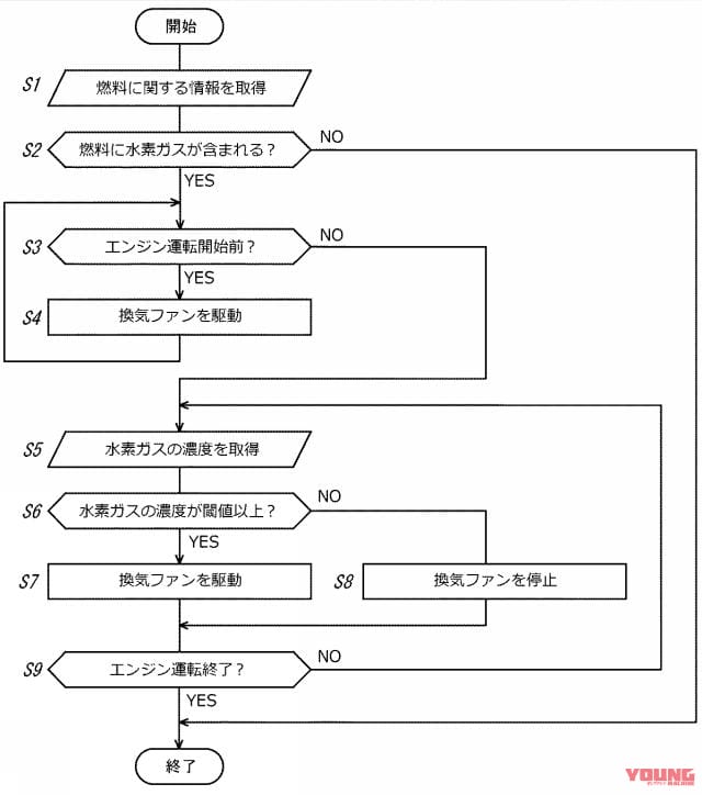 まずセンサーによって燃料に水素ガスが含まれるか否かを判定し、含まれていればエンジン始動前に換気ファンを回してクランクケース内を換気。エンジン始動後は、ケース内の水素ガス濃度を可燃範囲の下限よりも下に保つため、濃度が閾値を超えたら換気ファンを駆動し、閾値を下回っていればファンを停止する。