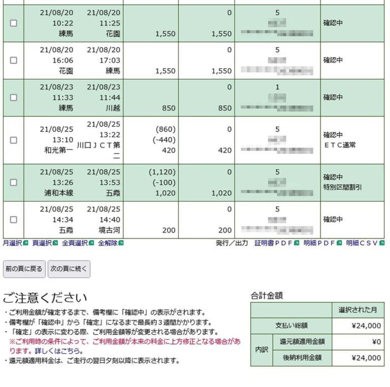 ここでひとつ気になったのが、この利用明細の画面の備考欄にある「確定」とか「確認中」という言葉。そして、この明細画面の下にある「ご注意ください」という見出しの下にある、・備考欄が「確認中」から「確定」になるまで最長3週間かかります ・「確定」の表示に変わる際、ご利用金額等が変更される場合があります *ご利用時の条件によって、ご利用金額が本来の料金に上方修正となる場合があります、という注意書きです。