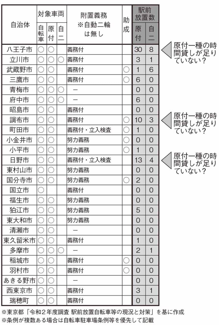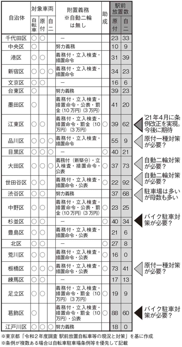 区市町村(条例のない4市町村を除く)の放置自転車等に対する取り組みは条例の対象車両や附置義務、助成金の有無に見て取れる。23区内は都下に比べれば圧倒的に車両の数が多いが、自治体による対策強度と駅前の放置車両数とはある程度比例しているようだ。自治体ごとの課題も見えてくる。