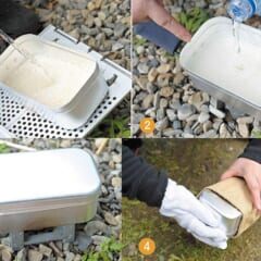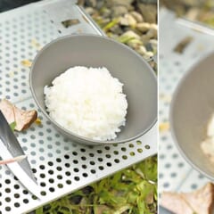 デザインがかわいいので小物入れとしていた使っていたメスティンを、流行りに乗って現役復活!! というか本来の目的で初使用。保温袋に入れて持っていったのは1合分の米(150g)、エスビットポケットストーブミリタリー(固形燃料14g)。