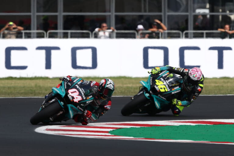 サンマリノGPでは、再びバニャイアがポールポジションから飛び出してトップを独走。ひたひたと追い上げてきたのは、今シーズンもっとも速さと強さを見せつけているファビオ・クアルタラロでした。マルケスとのような直接の抜き差しはありませんでしたが、緊張感のある競り合いが続きます。速いペースでバニャイアにプレッシャーをかけるクアルタラロ。すぐ背後まで接近しますが、やはり落ち着きを失うことなく、バニャイアが逃げ切って連勝しました。