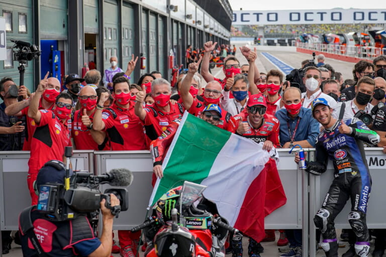 バニャイア選手が1位、バスティアニーニ選手が3位に入り、ドゥカティにとってはホームのミサノサーキット(Misano World Circuit Marco Simoncelli)にイタリア国旗を掲げる。