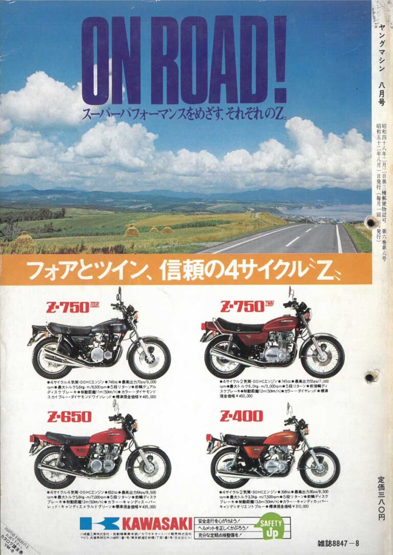 参考:ヤングマシン1977年8月号の表4に入っていたカワサキの広告には、「フォアとツイン、信頼の4サイクル“Z”」とある。4気筒のZ750FOUR/Z650、2気筒のZ750TWIN/Z400というラインナップだった。