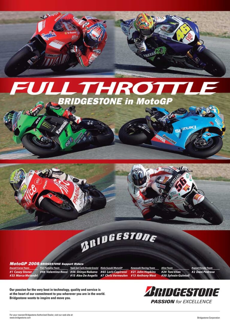 文中にある六本木のイベントでは、ブリヂストンがサポートする6チーム(レプソルホンダチームを除く)から1人ずつ参加してもらった。この年のPRポスターには、#1ケーシー・ストーナー選手、#46バレンティーノ・ロッシ選手、#21ジョン・ホプキンス選手、#7クリス・バーミューレン選手、#24トニ・エリアス選手、#56中野真矢選手の6名が掲載されている。