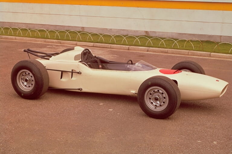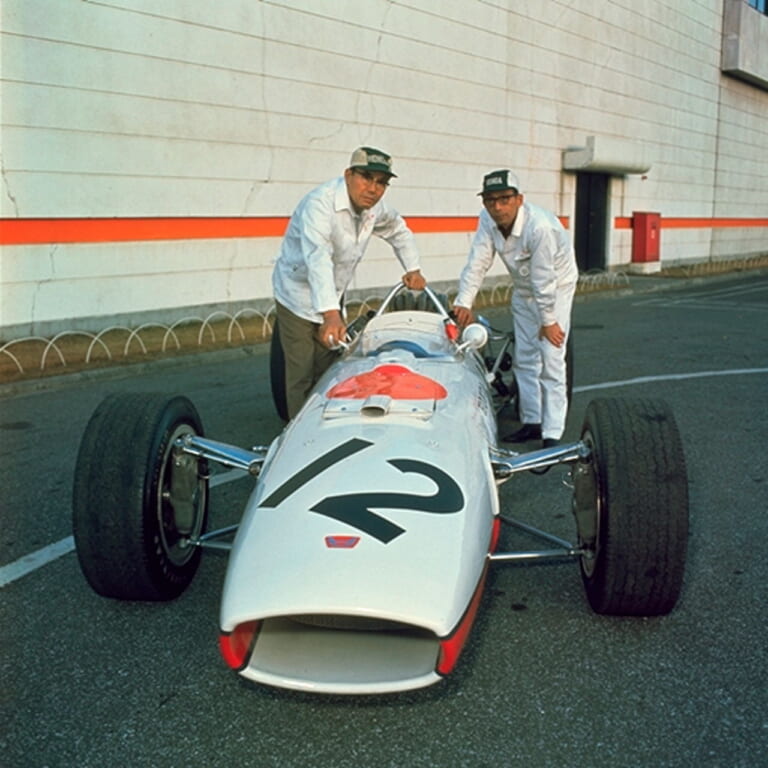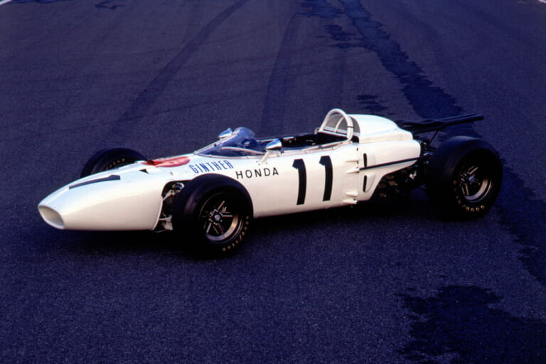 1966年のRA273で、左は本田宗一郎さんだ。この年はギンサー選手がランキング11位になり、コンストラクターとしては3ポイント/8位のリザルトだった。