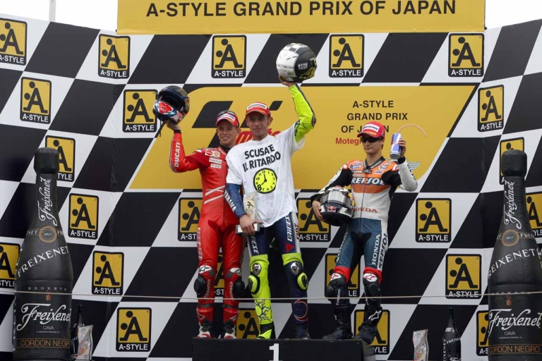 2008年の日本GPは、ヤマハワークスチームから参戦したバレンティーノ・ロッシ選手が予選4番手から追い上げ、レース中盤にドゥカティワークスチームのケーシー・ストーナー選手をパスしてトップに浮上。そのままストーナー選手を引き離したロッシ選手がトップチェッカーを受け、シリーズタイトル獲得を決めました。私にとっては、ブースイベントの運営関連や会社上層部のアテンドなどでなにかと忙しい日本GPですが、もちろん決勝レースはちゃんと見ていました。ただし、決勝終了直後には再びトークショーがあるため、優勝したロッシ選手と2位のストーナー選手、3位に入賞したホンダワークスチームのダニ・ペドロサ選手というブリヂストン勢による表彰台独占の様子を見届けてからすぐに、またしても地下通路を移動してメインゲート近くのブリヂストンブースに戻った記憶があります。
