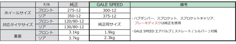 ホイールサイズは、フロントが純正2.75-12に対しゲイルスピードは3.00-12、リヤは純正3.20-12に対しゲイルスピード3.75-12とされ、対応するタイヤサイズは純正と同サイズ。重量はフロントが純正3.1kgから1.9kgに、そしてリヤは3.7kgから2.3kgまで軽くなり、前-1.2kg/後-1.4kg=前後で-2.6kgの軽量化を達成した。