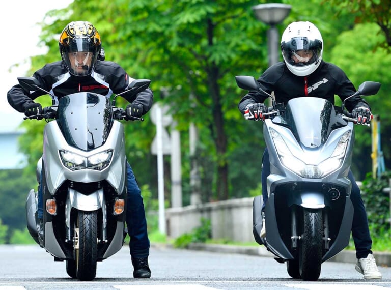 ハンドルの押し引きなどできっかけを与えるとすぐにバンクし、フロントからスイッと向きを変えるPCXに対し、NMAXはライダーの操縦にどこまでも忠実で、この2台のハンドリングは実に対照的だ。PCXは先代/現行モデルで段階的に接地感と旋回力を高めてきており、リラックスしたライディングポジションのまま不安なくコーナリングできるという点において右に出るものなし。これに対してNMAXは、やや背筋を伸ばした乗車姿勢から積極的にバンク角をコントロールするタイプで、その傾きに比例して舵角が付き、狙ったラインを気持ち良くトレースできる。まさにヤマハらしいハンドリングであり、原付二種スクーターでもスポーティーな走りを楽しみたい人にとっては、まさに打って付けだろう。