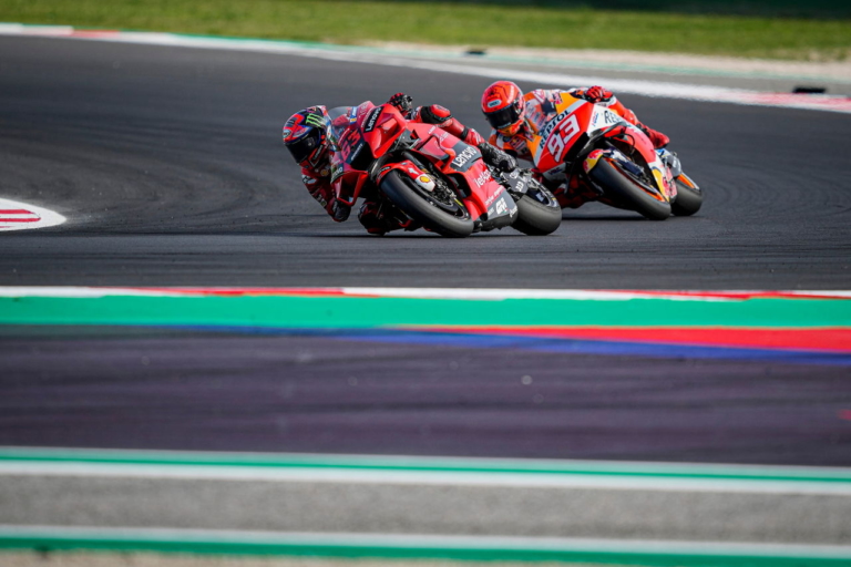 マルク・マルケス選手を従えて走るバニャイア選手。僅差で押さえ切ったアラゴンGPの再現なるかと思われたが……。