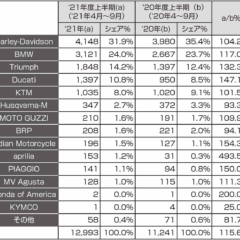 JAIAの発表によれば、’21年度上半期(4月〜9月)の輸入車バイクの新車登録台数は、前年同期比で115.6%となる好調ぶりを見せている。 メーカー別に見ても軒並み前年同期を上回り、中でもアプリリアは約5倍と大きく販売を伸ばした。この時期にニューモデルを市場投入したメーカーの伸びが際立つかたちとなった。 バイク人気の背景には新型コロナ禍の影響があり、輸入車だけでなく国産車の新車登録台数 […]