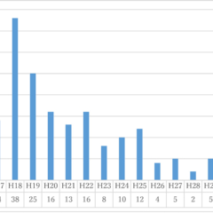 【グラフ1:自動二輪駐車場の助成場数の推移】助成金の条件緩和は平成31年('19年)4月に行われたが、助成場数に動きはない。もっとも数が多かったのは平成18年('06年)であり、駐車場法の改正や放置駐車取締りの民間委託などが始まった年にあたる。平成26年('14年)以降は助成場数が激減しているが、理由は定かではない。