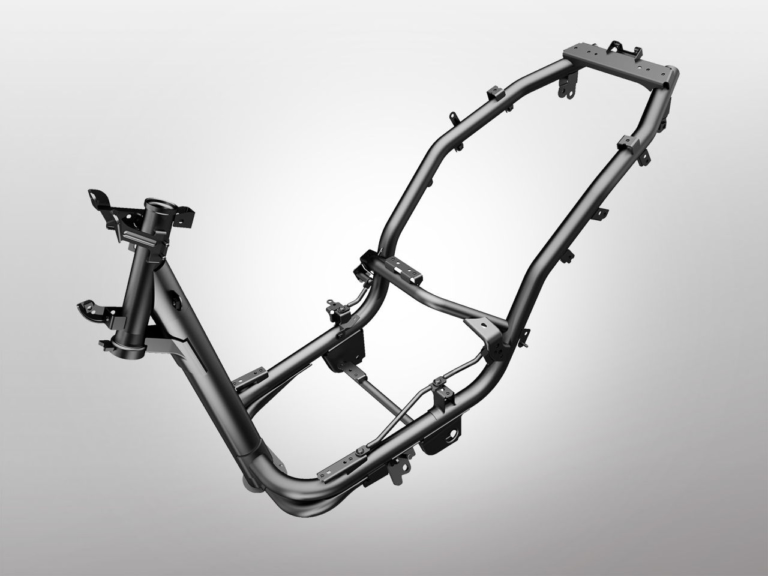 新エンジンの搭載・重心位置最適化と、ボディ剛性をバランスさせた新設計のアンダーボーン型フレームを採用。メインパイプは左右非対称で、またテンションバーによるチューニングにより強度剛性としなやかさをバランスさせました。さらに、スペース効率を配慮した設計により十分なシート下トランクスペースを確保しています。