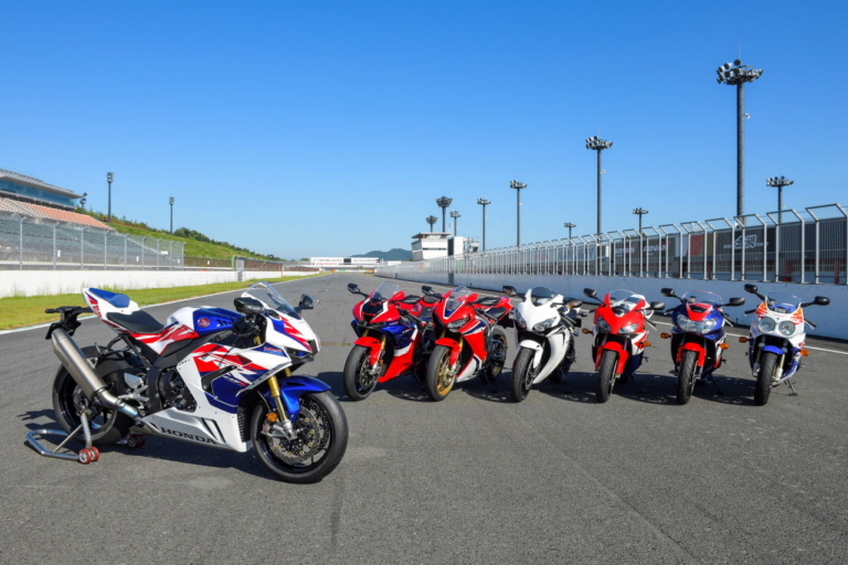 コチラはツインリンクもてぎのホームストレート上にて。左から、CBR1000RR-R FIREBLADE SP 30th ANNIVERSARY[2022]、CBR1000RR-R FIREBLADE SP[2020]、CBR1000RR SP[2017]、CBR1000RR[2008]、CBR1000RR[2004]、CBR900RR FireBlade[2000]、CBR900RR FireBlade[1992]だ。全モデルが揃っているわけではないが、大きなモデルチェンジで世代交代が起こったイヤーモデルを並べている。
