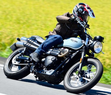 '21 トライアンフ ストリートスクランブラー [◯] 大きなピッチングからバンク主体で旋回する エンジンや車体など主要部分は共通のまま、構成パーツを変えることで多機種を展開するトライアンフのモダンク[…]