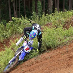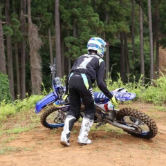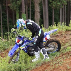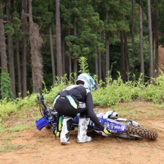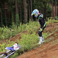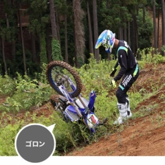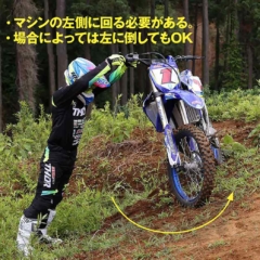 マナブ式で起こしても、乗車するためにマシンの山側に移動せねばならず、それだけでもタイムロス。足場が悪いなど条件が過酷な時は、このまま山側にマシンを倒し、もういちど車体を起こす方法もあり。いずれにせよ大幅なロスは避けられない。ちなみにここでハンドルを左に切っているのもポイントで、マシンが勝手に進みにくい。