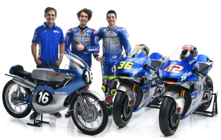 左が元ネタになった50ccレーサーで、右の2台は2020年を走ったGPマシン「GSX-RR」だ。
