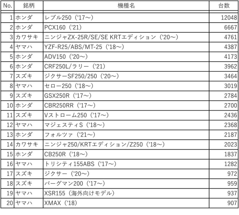 2021年 軽二輪 国内販売台数 上位20機種(二輪車新聞推定)