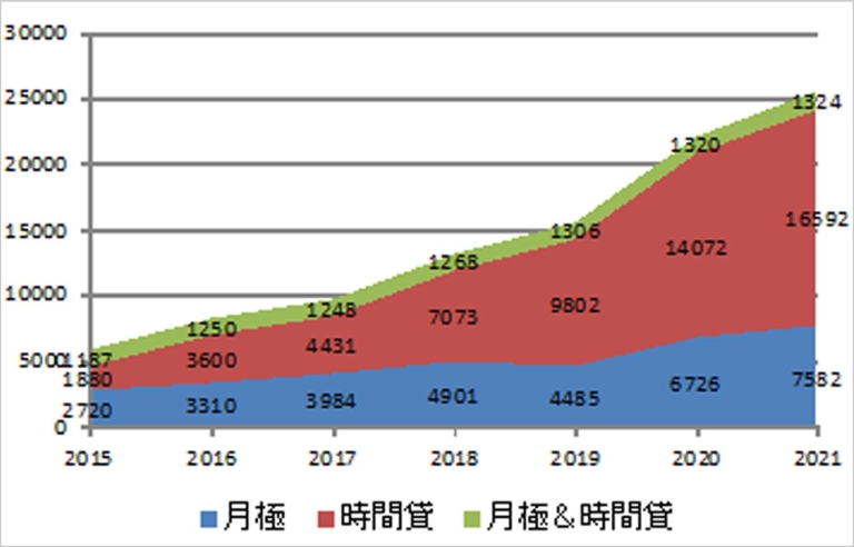 【グラフ2:駐車場種別の掲載割合】月極/時間貸/月極&時間貸の両方を備えている駐車場の掲載割合。時間貸が大きく増えている。