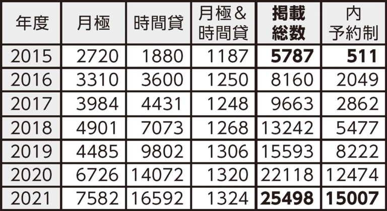 【表1:掲載物件数の推移】全国バイク駐車場案内サイト掲載総数のうち、予約制の占める割合が約8%から約59%に増えている。”時間貸で予約制”が増えたのだ。