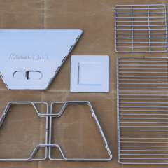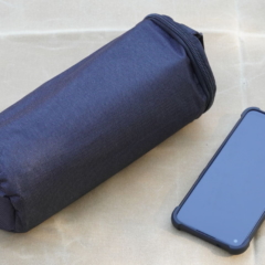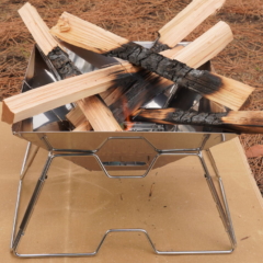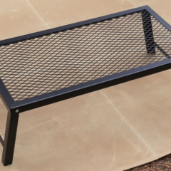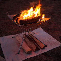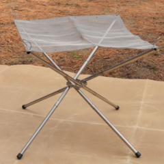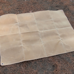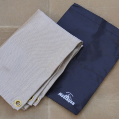 MONTAGNA 焚火グランドシート(1500円):焚き火台の下に敷くことで地面を高熱から保護するグラスファイバー素材の耐火シート。折りたためば鍋敷きに早変わり。四隅にはペグで固定するためのハトメも設けられている。サイズは約W78×H57cmで、収納袋付きだ。