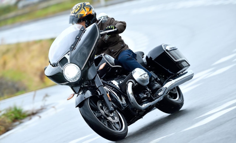 このR18トランスコンチネンタル、ハーレーと同様にフォークを逆オフセット&スランテッドアングルとした専用設計のフレームを採用する。巨大なフェアリングとトップケースによって常に高重心感は付きまとうが、動き出してしまえば操舵は軽快であり、それでいてグラッとくる恐さはない。ハンドリングは、軸距が1720mmもあるので(ウルトラリミテッドは1625mm)旋回力こそ高くはないが、倒し込みや切り返しの操作に対するレスポンスは良好だ。荷重に応じてリヤの車高を自動的に調整する電子制御サスペンションのおかげもあって、乗り心地は非常に優秀。ウェット路面でも接地感は薄れることがなく、安心してクルージングすることができた。