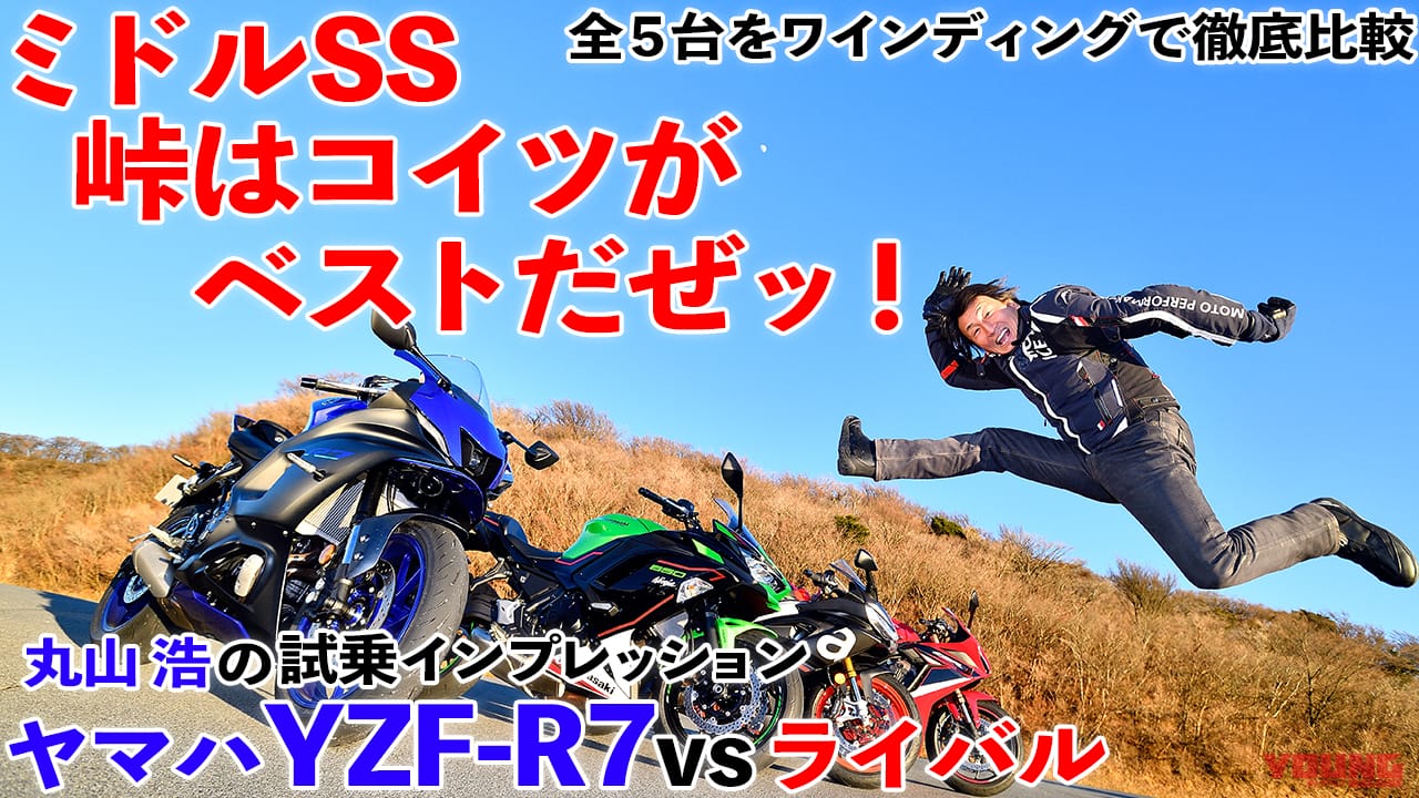 旧レプリカ乗りのオジサマ方、そのウズウズボタンを絶賛連打中のヤマハYZF-R7。前回の試乗でサーキットでの良さは分かった。じゃあ公道、特にオレたちの大好物である「峠」ではどうなのよ……ということで、アプリリアRS660、ホンダCBR650R、カワサキNinja650に+αの1台を加え、総勢5台でワインディング大チェック! 速さ、万能、安楽と、それぞれに特徴を持つライバルに対し、R7の武器っていったい何だ? 丸山浩が包み隠さず語っちゃうよ!