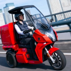 【AAカーゴ】3輪構造に大型スクリーンとルーフ、独立懸架リヤサスペンション、大径ホイールを組み合わせ、高い安定性を実現した電動3輪バイク。2018 グッドデザイン賞および日経優秀製品・サービス賞 2020/最優秀賞を受賞している。