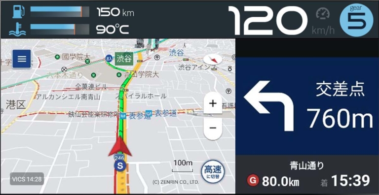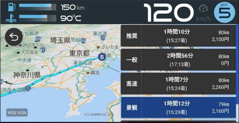 車両のメーターに表示させた場合も、ツーリングサポーターのナビゲーション画面に加えて、上部左側には走行可能距離・水温、右側にはスピードやギヤポジションが表示される。車両との完全連携が可能なところがmySPIN+ツーリングサポーターの大きなメリットだ。ツーリングサポーターはナビアプリとしてもとても使いやすく、ルート検索した場合、右上の図のように候補ルートを複数表示してくれる。