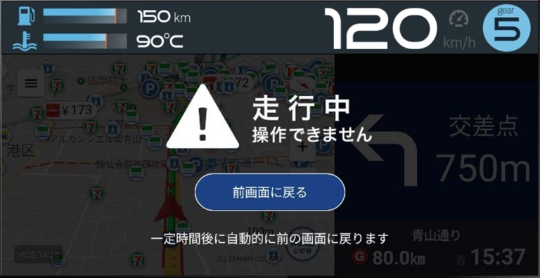 車両とツーリングサポーターが連携することで、走行中か否かのチェックを行うことができ、走行中にハンドルのコントローラーや画面タッチでナビの操作をしようとすると図のようにメーター画面にウォーニングが表示される。これが従来のスマホナビとは大きく異なる点で、ライディング中の安全性向上にも大きく寄与してくれる。