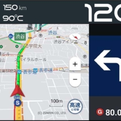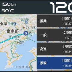 車両のメーターに表示させた場合も、ツーリングサポーターのナビゲーション画面に加えて、上部左側には走行可能距離・水温、右側にはスピードやギヤポジションが表示される。車両との完全連携が可能なところがmySPIN+ツーリングサポーターの大きなメリットだ。ツーリングサポーターはナビアプリとしてもとても使いやすく、ルート検索した場合、右上の図のように候補ルートを複数表示してくれる。