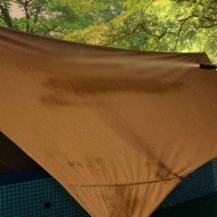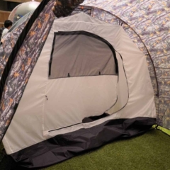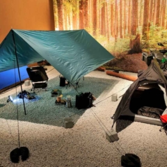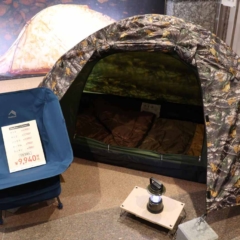ライダー向けのキャンプギアをまとめた展示も。BASICスクエアタープは4900円と格安だ。