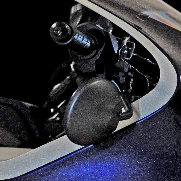 アッパーカウルの内側からステーが生えているように見えるミラーは、ハンドルグリップよりも下に鏡面を配置。スクリーンまわりをスッキリ魅せる効果がありそうだ。