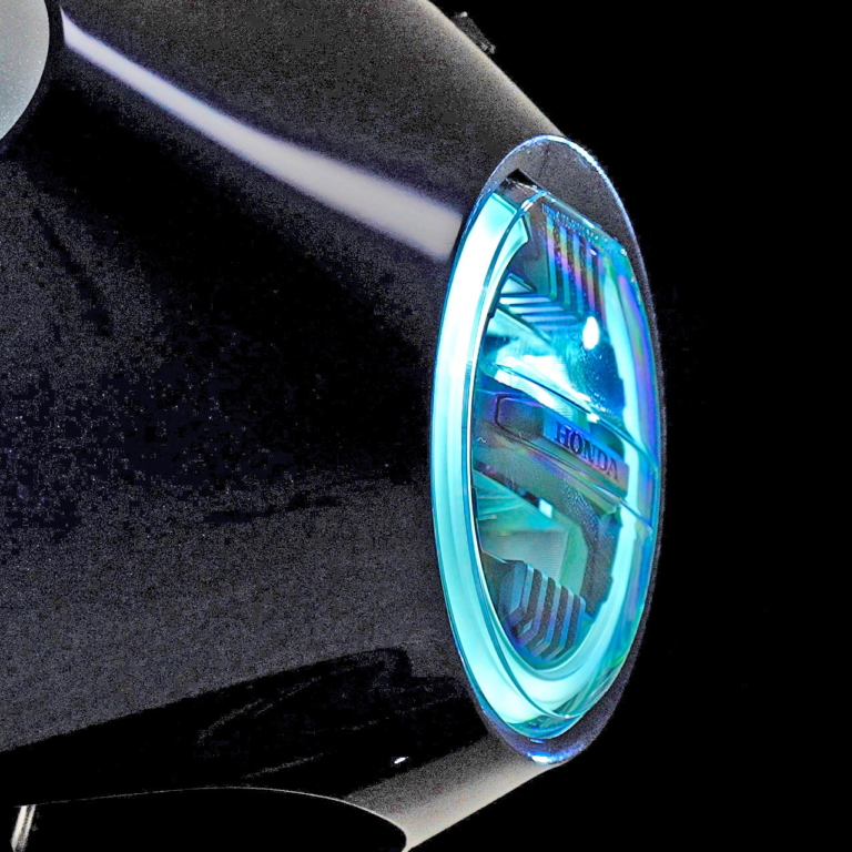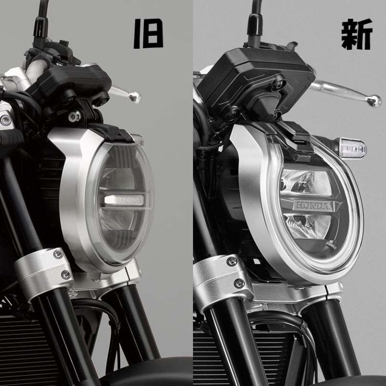 ヘッドライトはCB1000Rと似ているように見えるが、少なくとも現行モデルとは少し違う。むしろマイナーチェンジ前のCB1000Rによく似ているだろうか。現行CB1000Rは軽くスラントしているのに対し、以前のCB1000Rは垂直配置されていて、ヒートシンク(?)のような補機もよく似ている。ライトの構成としてはLEDを上下2段に配置し、DRLと思われるU字型のリングが周囲に配置されている。