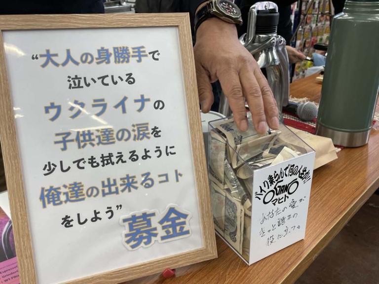 「BikeJIN」(実業之日本社発行)に連載記事を持ち、ラジオのマリンFMで「Weekend Garagehouse」のパーソナリティを務めているマヒトさんは、「ウクライナの子供たちのことを考えたら、いても立ってもいられなくなった」と、バイク用品販売店の2りんかんの石渡社長に相談して、6日に和光店で募金活動を行いました。