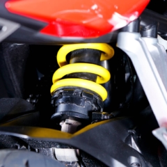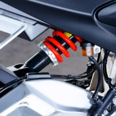 フロントフォークは正立式で、フロントブレーキキャリパーも片押し2ポットと非常にベーシック。サスペンションの調整はリヤのプリロードのみできる。スイングアームもスチール製で、単体重量4.8kgと軽い。