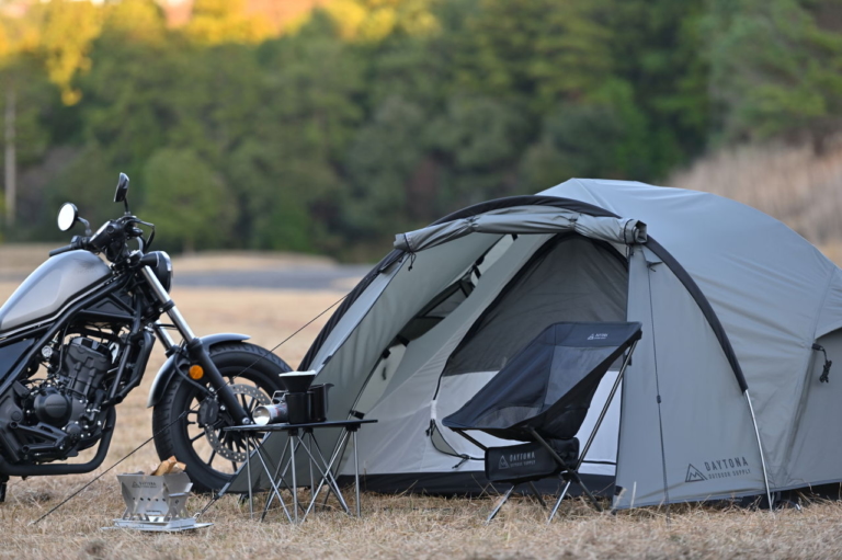 キャンプツーリングを愛するデイトナスタッフが、積載性とコンパクトさ、キャンプ地での快適性のバランスを考慮して作り上げたキャンプギアシリーズが「デイトナアウトドアサプライ」だ。モーターサイクルショー会場では、新作のツーリングテント「ドームルーム」をはじめとしたキャンプ用品を展示(東京・大阪のみ/大阪会場は収納状態の展示のみ)する。