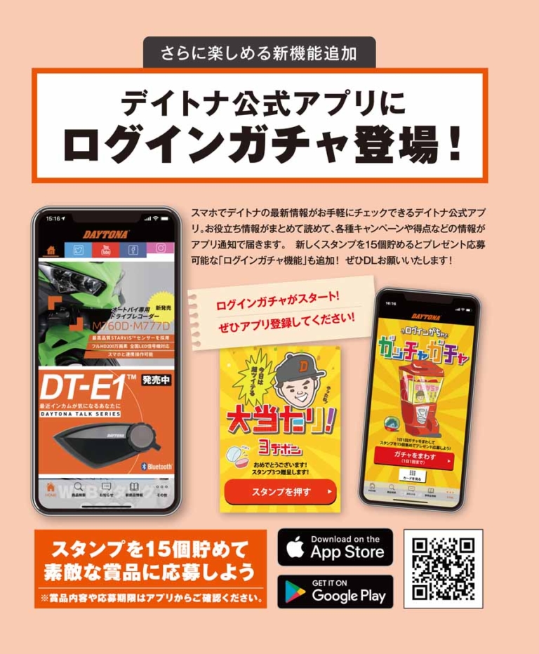 各モーターサイクルショーに出展するとともに、デイトナのWebサイトではモーターサイクルショー特設サイトと、創業50周年記念サイトを同時に公開する。また、デイトナ公式アプリも「ログインガチャ」をスタートし、会場に足を運べないファンも楽しめるコンテンツが用意されるという。